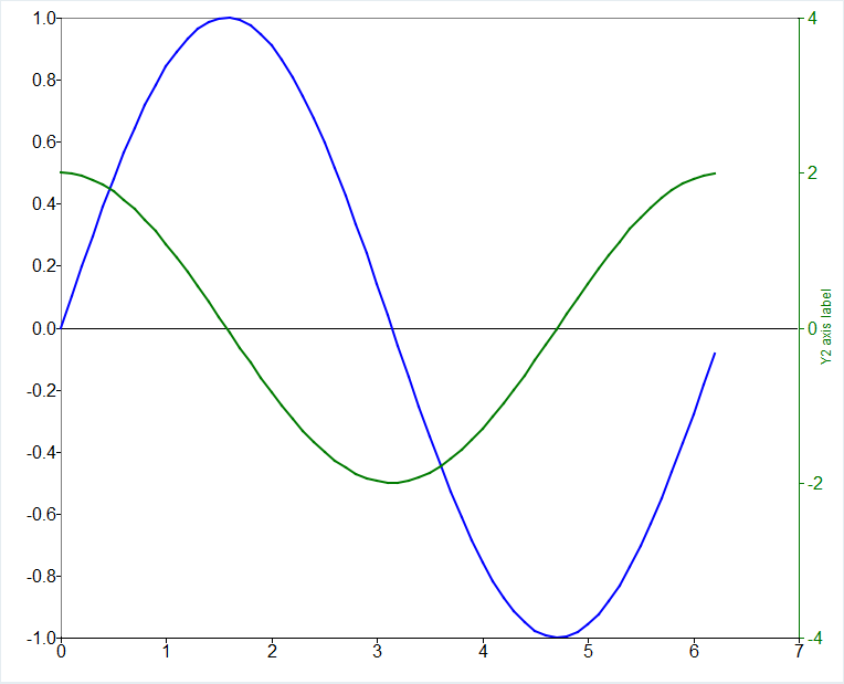 [ax h1 h2] = plotyy(x, sin(x), x, 2*cos(x));