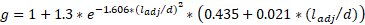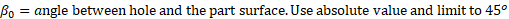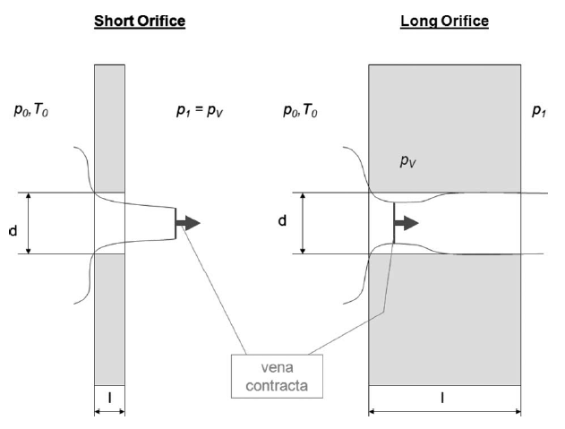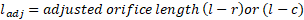 The length of the orifice affects the reattachment of the orifice flow. If the flow can reattach inside the orifice length the losses can be reduced (Cd increased). The program adjusts the length due to a fillet or chamfer so the user should enter the orifice length as if there was no fillet or chamfer. The program does not adjust the length for the hole angle. The user should enter a hole length that includes the angle effect. Equation taken from ref 2.