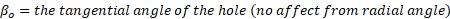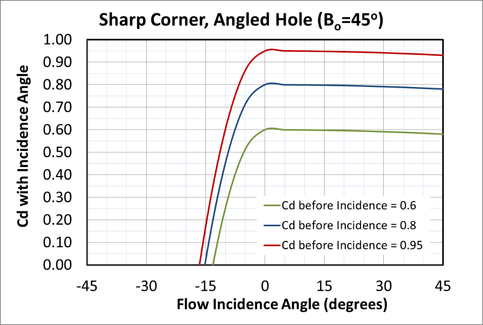 The final Cd is very sensitive to the incidence angle effect. If the upstream flow approaches a hole at a steep angle a large separation region can fill a significant portion of the hole. This will decrease the Cd and flowrate. The incidence angle affects are taken from ref 1. The hole corner treatment and the angle of the hole influence the incidence angle effect.