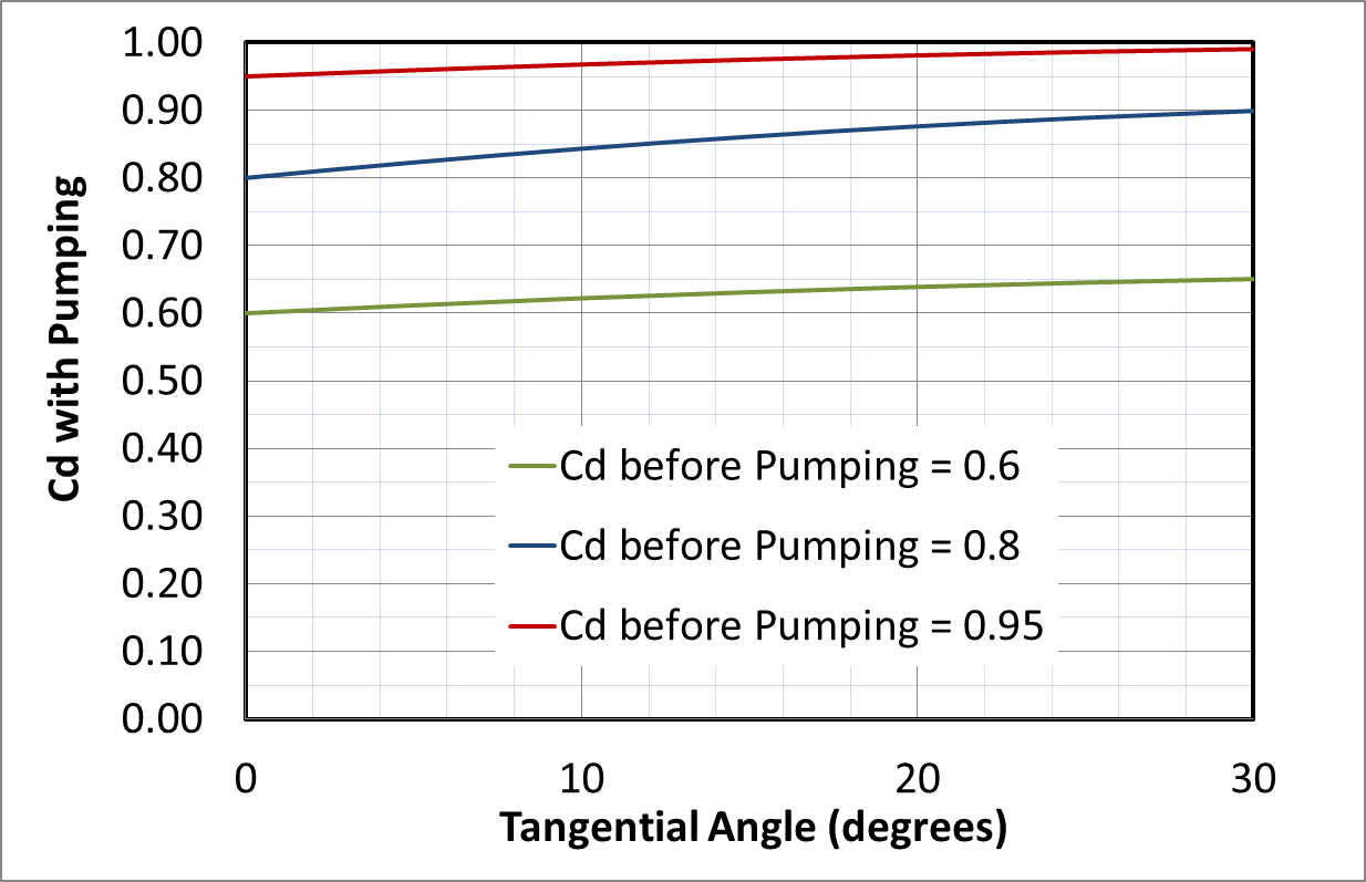 Idris (ref 1) describes a pumping effect that accounts for the fact that the Cd for Incidence angle = 0o is higher for a rotating hole (which must be angled to achieve zero incidence) that it is for a stationary hole. The physics behind this are not clear. The effect is included to match the Idris data.