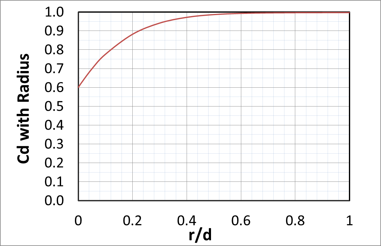 The plot demonstrates the incidence effect and may not represent the final Cd. The absolute value of the incidence angle is used in this equation. The maximum incidence angle allowed is 45o. The maximum r/d allowed is 0.25 .