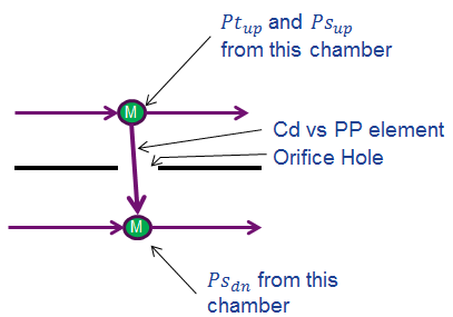 The Effective area Orifice element is like Orifice element and the value of the discharge coefficient or loss coefficient is a function of the orifice pressure ratio or orifice pressure drop. The orifice may be fixed in space or rotating about the engine centreline and each may be positioned at any angle relative to the coordinate system. Effective area Orifice elements uses an input of Orifice mechanical Area/Diameter & Loss parameters with a standard isentropic flow relationship to calculate the element flow rates. This element does not model any fluid inertia.