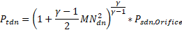 The flow is first expanded from the vena contracta throat to the exit conditions before any effect of heat addition, QIN, is considered. it is assumed that the flow is expanded adiabatically (limited to Mach number = 1.0) to the mechanical area of the orifice at the exit static pressure, . The static pressure exit flow parameter, exit Mach number and adiabatic exit velocity is calculated as: