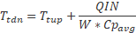 The effect of heat addition specified as QIN is added next, assuming that only the exit temperature and velocity, and not the exit Mach number, are affected. The temperature rise (or drop if QIN is negative) is calculated using an average value of specific heat (Cp)