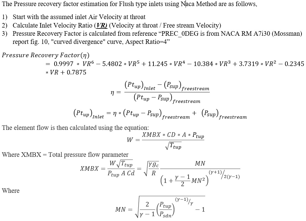 A NACA duct also sometimes called a NACA scoop or NACA inlet, is a common form of low-drag air inlet design. A NACA duct allows air to flow into an internal duct, often for cooling purposes, with a minimal disturbance to the flow. The design was originally called a submerged inlet, since it consists of a shallow ramp with curved walls recessed into the exposed surface of a streamlined body. FlowSimulator Naca scoop element calculate pressure recovery factor & flow rates through scoop/flush type inlets for given geometry & operating conditions.