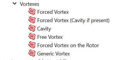 - Cavity vortex - forced vortex which gets its pressure ratio and temperature rise from an angular momentum and energy analysis performed in the Flowsimulator cavity solver routine