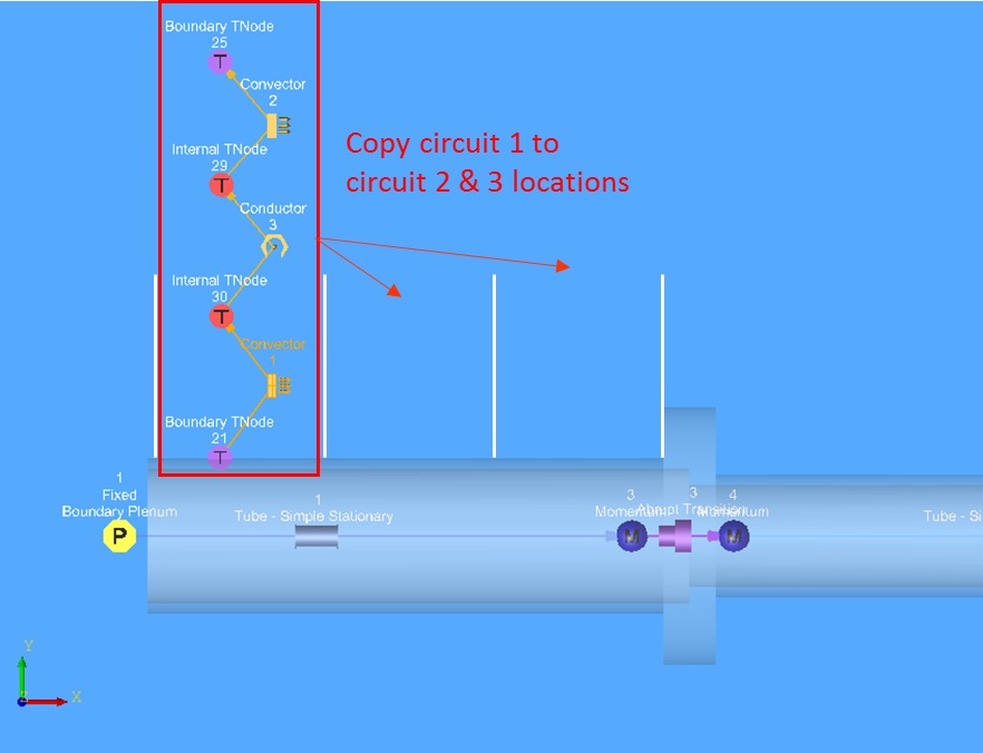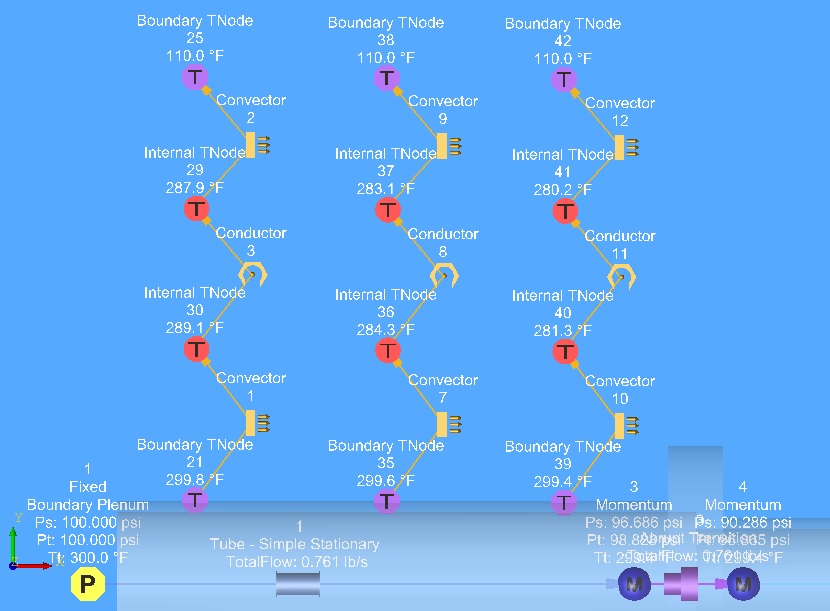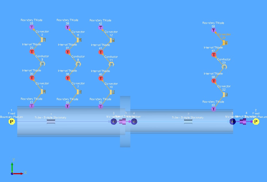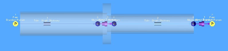 - The flow in the larger pipe (left) is being modeled by a tube element that has 4 stations, which translates to 3 segments. Heat transfer for that pipe will be coupled to segments in the tube element, which will allow for thermal convection to use HTCs directly from the tube. The thermal model on the smaller pipe will demonstrate a different method of coupling the flow and thermal network. The momentum chamber at the end of the pipe will be coupled to the thermal network.