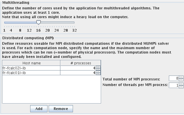 The Distributed computing (MPI) part is used to specify resources useable by MUMPS. It is necessary to specify this solver in the solving options of the project, by selecting either MUMPS: parallel direct solver (Local) or MUMPS: parallel direct solver (Distributed).
