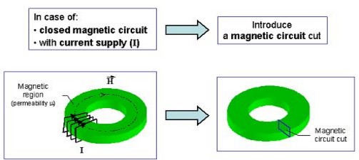 A cut of magnetic circuit is introduced in a model when there is a need to solve an electric connectivity problem (in 3D).
