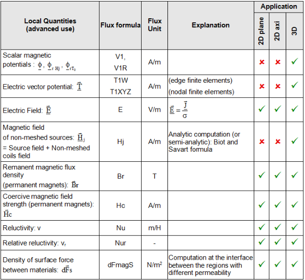 Usual local quantities available in advanced use are presented on the table below.