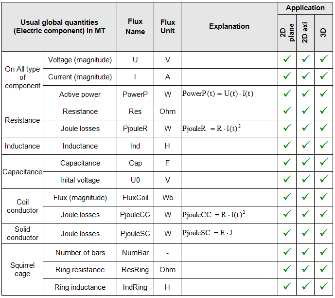 The usual global quantities available for a computation on an electrical component in magnetic transient are presented in the table below.