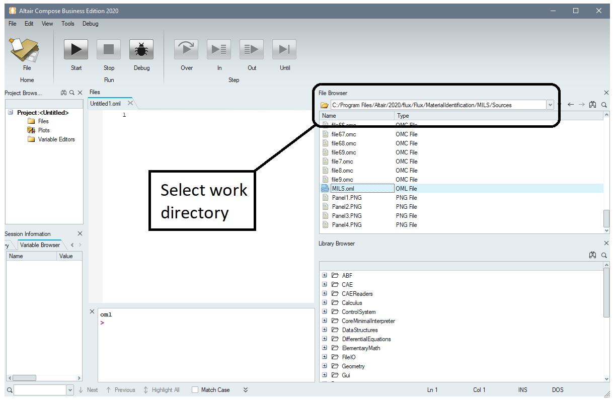 Figure 1. Setting Compose's File Browser to MILS work directory - Run script MILS.oml to launch MILS. Note: This procedure clears all variables stored in Compose’s variable browser and closes all figures generated by previous computations.