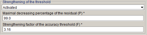 This strategy is activated by default, except for 2D hysteresis project, for the optimal with stabilization stage relaxation method for non-linear project and 2D initialization strategy for Skew. - Strengthening of the threshold : This adaptive criteria strategy is meant to