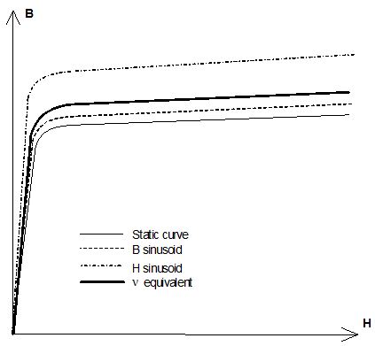In reality, neither B nor H is sinusoidal. The results obtained with the equivalent curves calculated in the two extreme cases most often include the exact result. That is why the equivalent curve can equally be calculated by means of a linear combination between these two extreme cases (see the equivalent models provided in Flux).