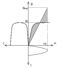 Real magnetic state (Bi , Hi ): for B = Bi we get H = Hi The equivalent value Heqi is obtained by horizontal displacement from the point (Hi, Bi ) in order to work at equivalent energy: for B = Bi we then get H = Heqi The quantity Heqi is calculated in such a manner as to have equality of the shaded surfaces. |