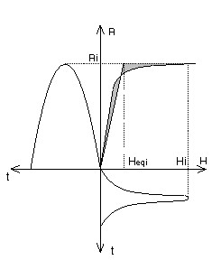 Real magnetic state (Hi, Bi ): for H = Hi we get B = Bi The equivalent value Beqi is obtained by vertical displacement from point (Hi, Bi) in order to work at equivalent energy: for H = Hi we then get B = Beqi The quantity Beqi is calculated in such a manner as to have equality of the shaded surfaces. |