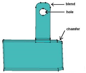 The hole has been filled, the blends and chamfers have been removed (transformed into right angles). The geometric object is now much simpler to mesh. |