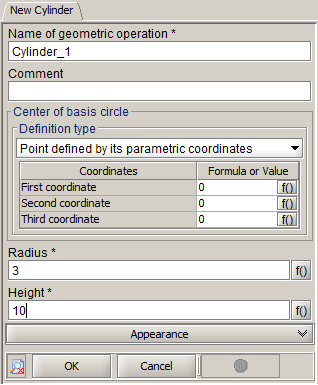 • A Geometric operation Cylinder_1. This geometric operation is a specific entity of the modeler that permits to ensure the cycle of life of the primitive (creation - modification - removal).