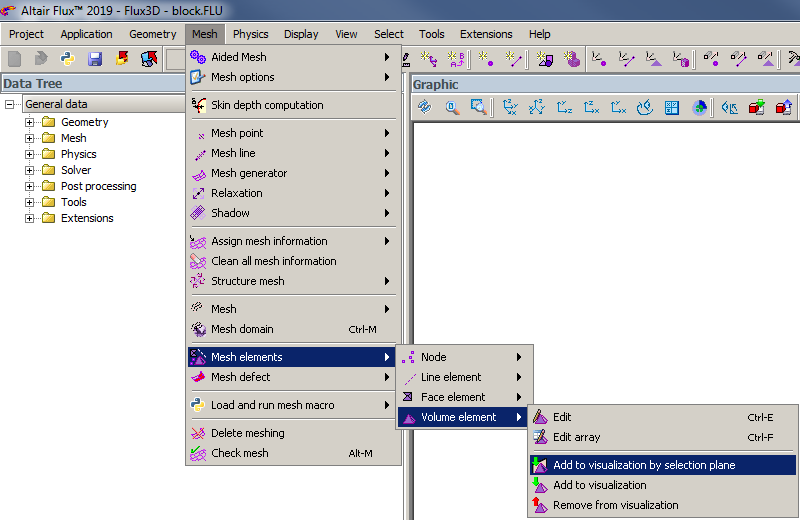 In the Flux3D menu Mesh, it is possible to visualize the volume mesh by a selection plane. This command allows you to create all the visualization volume elements on the same side of the plane.