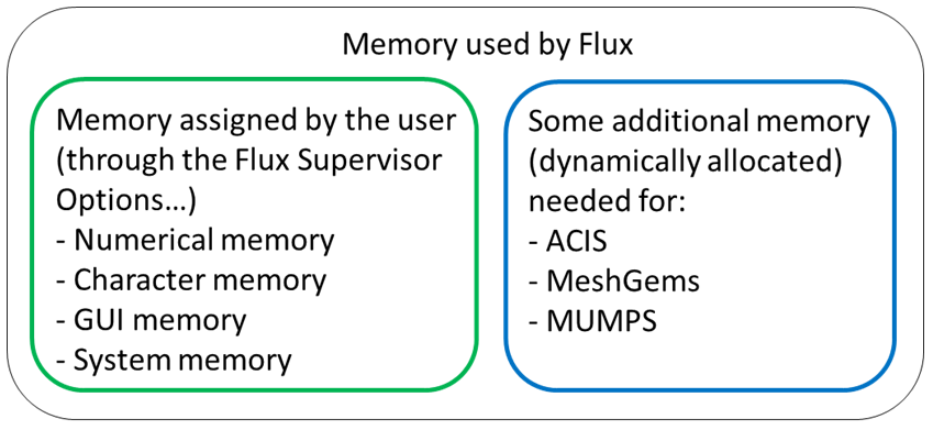 In this mode, the numerical and character memories are dynamically managed by Flux itself during its execution. So, the user no longer has to configure both memories.