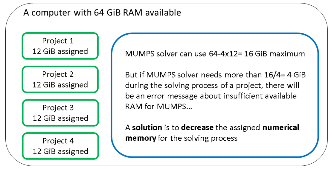 4 Flux 2D projects solving processes in parallel using MUMPS solver on a computer with 64 GiB RAM.