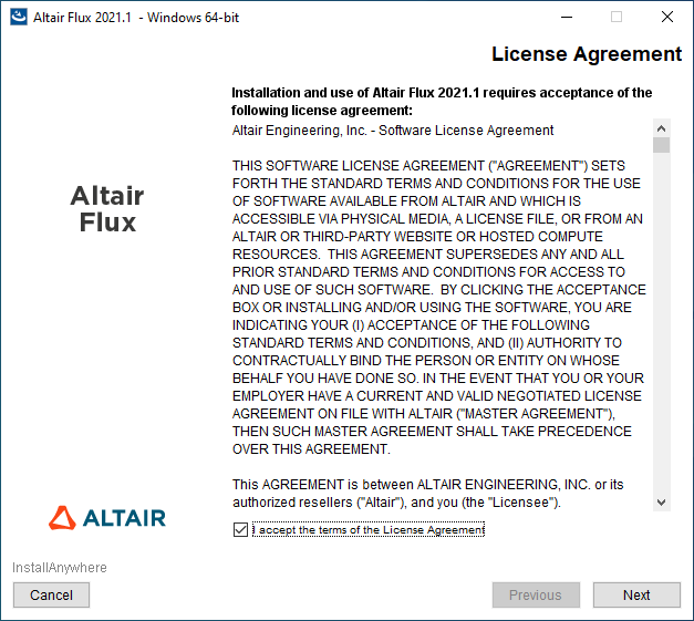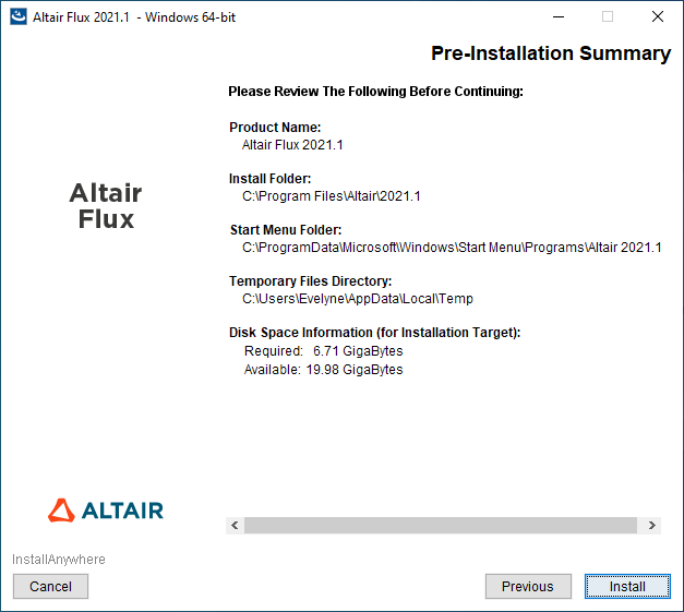 - with a user account: the installation directory is C:\Users\<username>\Altair\2021.1