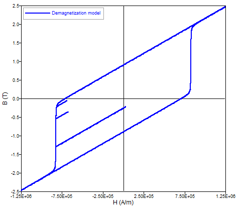 Avec ce modèle non-linéaire, il est possible de prendre en compte la désaimantation irréversible en cochant la case prévue à cet effet. Le modèle est basé dur un modèle statique de Preisach et peut s’appliquer dans n’importe quel quadrant de la caractéristique B(H) de l’aimant: