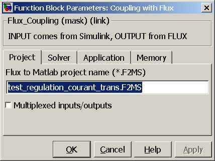 Permet de renseigner le nom du projet *.F2MS (Flux to Matlab Simulink) qui a été généré à partir de Flux pour assurer le couplage entre les deux logiciels. Attention à bien noter l'extension .F2MS |