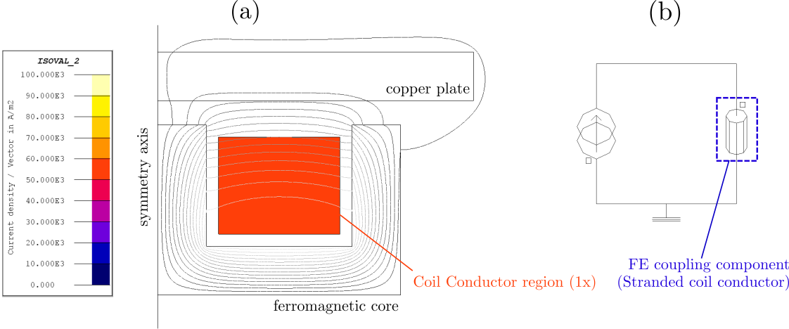Figure 3. Projet Flux 2D modélisant une bobine de 20 tours dans un dispositif de chauffage par induction fonctionnant à 1 kHz. La densité de courant affectée par les effets combinés de peau et de proximité est indiquée en (a). Le circuit électrique couplé contenant un composant de couplage FE pour chaque région est représentée en (b).