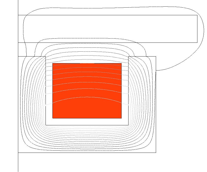 Pour comparer l'utilisation des régions de type conducteur massif et de type conducteur bobiné, considérons la modélisation dans Flux 2D d'un dispositif de chauffage par induction constitué d'une bobine de vingt tours autour d'une structure ferromagnétique linéaire et une plaque de cuivre .La bobine elle-même est formée d'un conducteur en cuivre de section circulaire et alimentée par un courant sinusoïdal à différentes fréquences