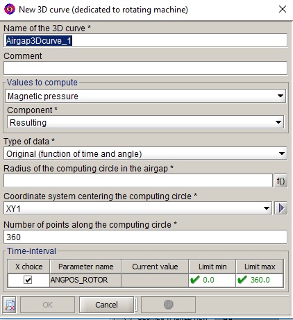 Les courbes 3D dédiées aux machines tournantes permettent de calculer les valeurs d’une formule le long d’un cercle de calcul disposé autour de l’axe de rotation d’une machine tournante. Ces valeurs sont collectées pour une série de pas de temps (fonctionnalité disponible uniquement en application Magnétique Transitoire). Une fois collectées, les valeurs sont présentées sous la forme d’une courbe 3D dont les abscisses sont le temps et la position angulaire le long du cercle de calcul. Une option spécifique permet éventuellement de calculer ces valeurs dans un domaine de Fourier 2D, soit en fonction de l’harmonique moteur et de l’ordre spatial.Options de la boite de création
