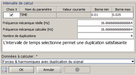 Dans la boite de calcul de forces, il est possible à l'utilisateur de choisir l'application d'une duplication temporelle, pour les dispositifs ayant un comportement périodique dans le temps, notamment les moteurs. Cette duplication consiste à répercuter les valeurs calculées sur la plage de temps définie, pour obtenir automatiquement les valeurs sur une période mécanique.