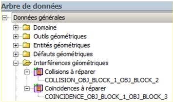 - Les interférences « Collision » sont automatiquement détectées si l'option Détection des collisions est à OUI. Elles apparaissent dans l'arbre des données sous le nœud Interférences géométriques.