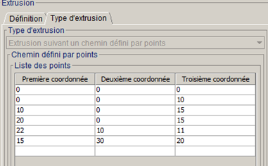 L'opération géométrique Extrusion suivant un chemin défini par des points permet d'extruder une ou plusieurs faces (appartenant à une esquisse ou appartenant à un objet) d'une même esquisse selon un chemin défini par des points donc les coordonnées sont renseignées par l'utilisateur.