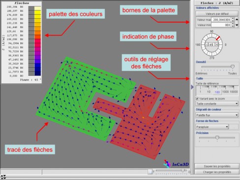 - la palette des couleurs indiquant la correspondance entre le dégradé des couleurs et les valeurs de la grandeur spatiale affichées sur les supports ; cette palette peut être redimensionnée et/ou déplacée par l'utilisateur à l'aide de la souris afin de la positionner sur le tracé des flèches et discerner plus aisément la valeur de la grandeur spatiale à tout endroit du support. Il est à noter tout en bas de cette zone une indication de phase, dont la signification est expliquée ci-dessous