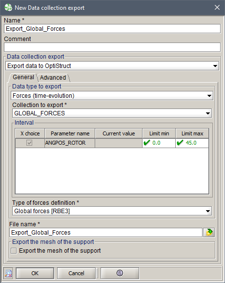 Figure 3. Boite de dialogue dédiée à la création d'un fichier d'export pour OptiStruct dans Flux 2D, montrant l'option des Forces globales [RBE3].