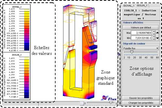 | Zone graphique standard | Zone contenant la vue géométrique du dispositif avec l'affichage des isovaleurs/isolignes calculées. |