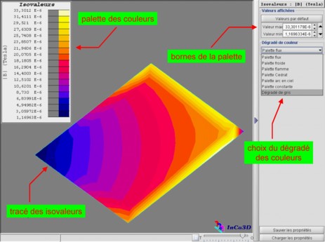 - la palette des couleurs indiquant la correspondance entre le dégradé des couleurs et les valeurs de la grandeur spatiale affichées sur les supports ; cette palette peut être redimensionnée et/ou déplacée par l'utilisateur à l'aide de la souris afin de la positionner sur le tracé des isovaleurs et discerner plus aisément la valeur de la grandeur spatiale à tout endroit du support