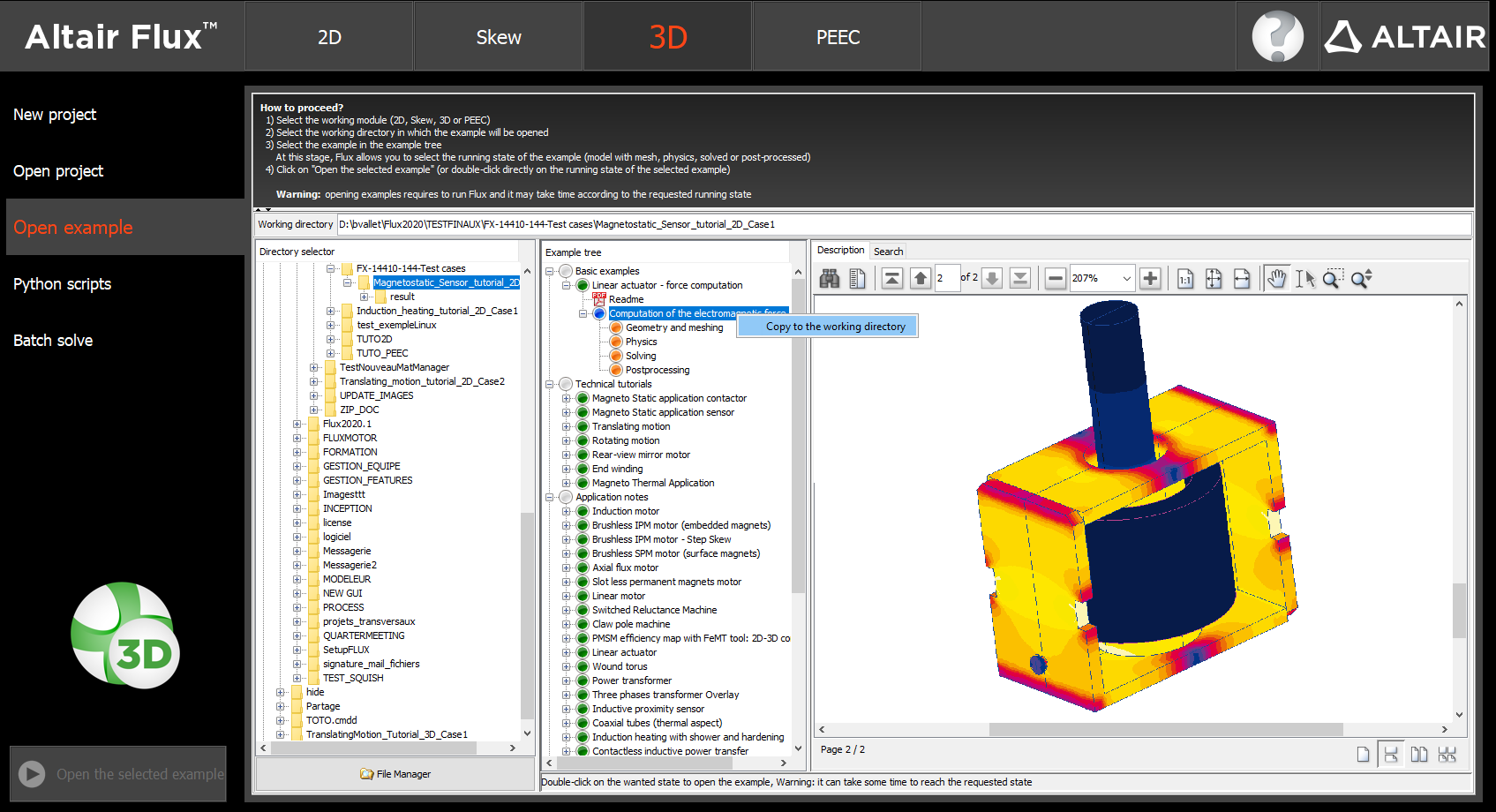 Ce contexte permet d'ouvrir un des exemples proposés dans l'état demandé (modèle avec maillage, avec physique, résolu, exploité).