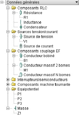 Les éléments du circuit sont listés dans la zone d'affichage correspondant à l'arbre des éléments (figure ci-dessous).