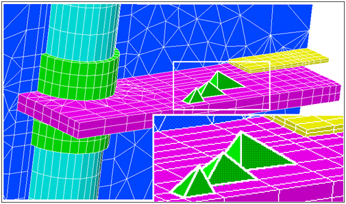 S'il est naturel en 2D de mélanger des éléments triangulaires et rectangulaires, mélanger en 3D des éléments hexaédriques et tétraédriques peut poser certains problèmes.