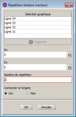- répétition linéaire (vecteur) : répétition selon un vecteur défini par un delta sur les abscisses (Dx) et un delta sur les ordonnées (Dy) et un nombre de répétitions.