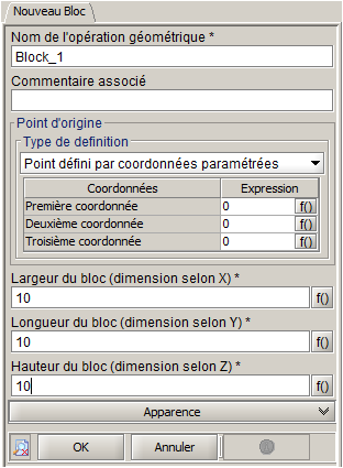 Choix du nom de l'opération géométrique résultante (par défaut : BLOCK_1) |