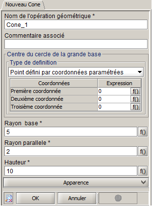Choix du nom de l'opération géométrique résultante (par défaut : CONE_1) |