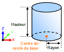 - Les dimensions du cylindre (rayon et hauteur) appliquées dans le repère actif