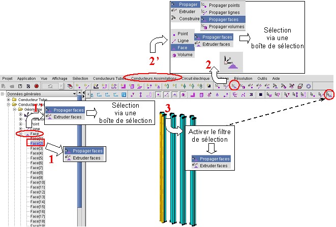 Pour activer la commande Propager faces, qui nécessite la sélection de données, choisir l'une des méthodes sur la figure suivante :