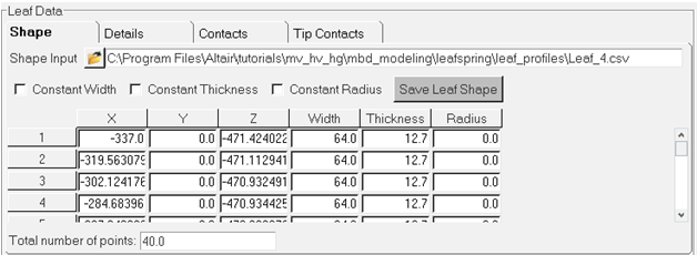 The Leaf Spring Builder is a utility designed to work with MotionView and the vehicle modeling libraries included with MotionView. Spring geometry, bushing rates and a number of other physical constants are required as input to the model. Reasonable defaults for data are included for many fields, which will make the model run. Accurate data should be substituted as it becomes available. The output of the utility is a beam and mass model of a leaf spring, in either a MotionView system definition file or a complete MotionView model.