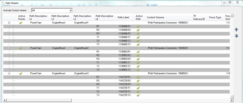 The Utility builds a list of transfer paths and adds proper descriptions to the attachment point in the Point tab, assigns the labeled subcase to the corresponding path in the TF tab, and assigns force data matching the Grid and/or Element ID to the proper path in the Force tab.