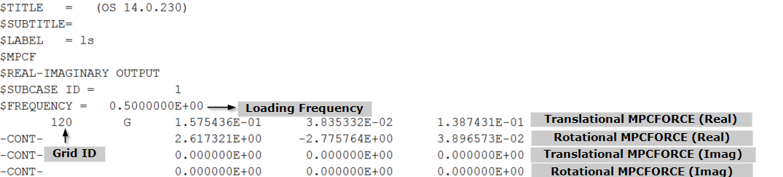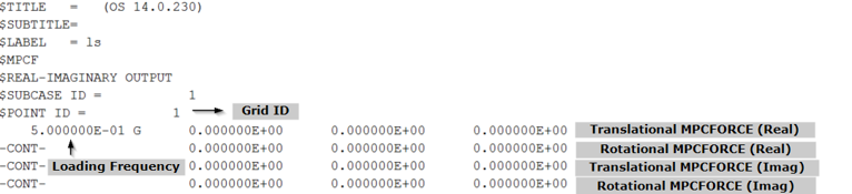 This section contains details about PCH output for various Frequency Response Analysis with corresponding output parameters (wherever applicable). Example, PCH output from actual models is illustrated with information about the various sections of the output.