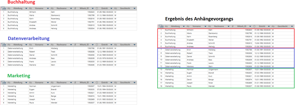 Monarch Data Prep Studio können Sie Datensätze von ähnlichen Tabellen anhängen. Das Ergebnis ist eine neue Tabelle, die alle Spalten der kombinierten Tabellen enthält: